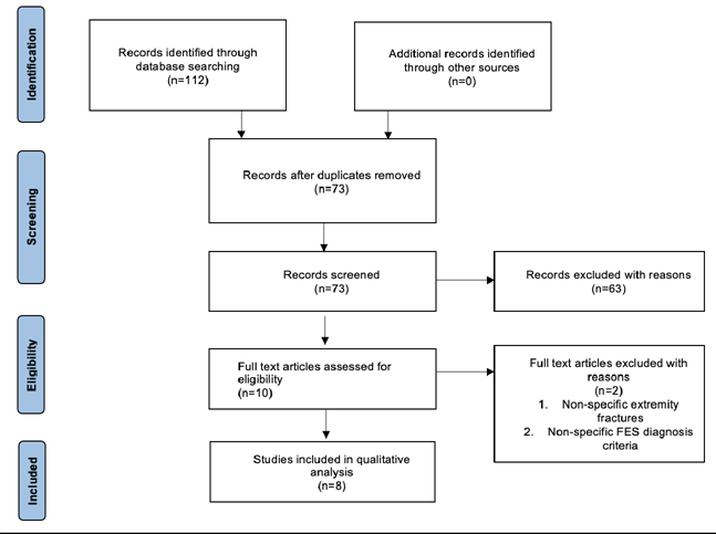 Utilizing the 4 databases and the search strategy described above, 112 studies were initially identified. No additional records were identified through other sources. 39 studies were found to be duplicates and instantly excluded. Further screening of titles and abstracts excluded 63 studies of the remaining 73, due to not meeting the eligibility criteria of this study. The full texts of the 10 studies remaining were screened once again, 5 from PubMed and 5 from EMBASE. This review included 8 eligible studies that were identified from the remaining 10. These 2 studies were excluded due to non-specific description of patient fracture types and the other didn’t describe a FES criterion for diagnosis. The PRISMA flow diagram below (Figure 1) provides an overview of the search strategy and process of selected studies.