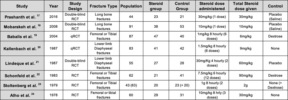 Methods: A systematic search was performed using PubMed, EMBASE, and others, for studies that used prophylactic corticosteroids in patients with at least one long bone fracture.