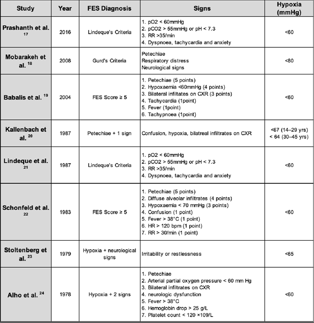 Stoltenberg et al. This study utilized hypoxia, neurological signs, and irritability to diagnose FES, and despite having the broadest criteria from all other studies, only 2 patients in the control group and none in the steroid group developed FES. The authors had a third group, a control group given dextrose where 3 developed FES. This was found to be statistically insignificant; however, it is important to take into consideration that the population size was small. Despite these findings, it was found that 15 patients developed hypoxia in the control groups compared to 3 in the steroid group, this was deemed to be statistically significant. [23]