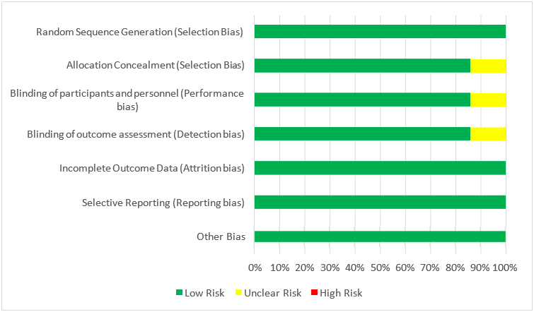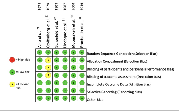 All RCTs described a well-defined primary outcome that was the same for all RCTS included in this study; however, secondary outcomes differed slightly besides hypoxaemia which was investigated throughout. Despite many studies having different criteria for diagnosing FES, the respective criteria were specifically described and argued for, with each study detailing their respective PICO components. Population sizes were small, ranging from 43 to 91, with the majority having equal steroid vs control groups. With regard to the six RCTs, randomisation was clearly stated in these studies, with alternate sequence randomization utilized in the qRCTs. Random sequence generation was constructed using sealed envelopes18, while the remaining RCTs did not specify. Double blinding were described in four studies [17, 18, 21, 22,] though allocation concealment reporting was at times vaguely reported as demonstrated below in Figure 2. Studies reported follow up periods ranging from 48 hours to 5 days, which was sufficient for detection and treatment monitoring of FES; however, it limited analysis of secondary outcomes that may take longer to be diagnosed, thus at risk of reporting bias. The study by Stoltenberg et al [23] lacked clarity and specificity regarding the blinding of personnel, hence potentially leading to bias. All studies provided thorough reporting effects of the intervention.