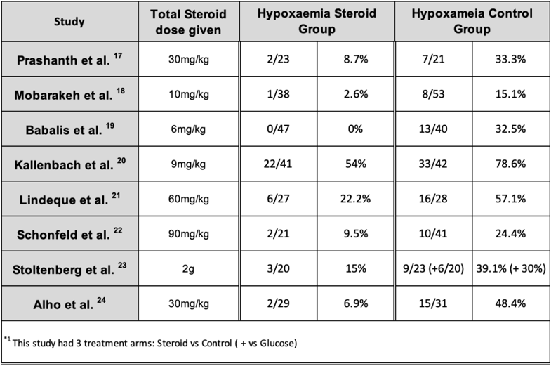 Authors from 7 out of 8 studies also assessed the effect of corticosteroids in preventing the incidence of hypoxaemia, with the exception being Prashanth et al. The latter did not distinguish if there were any patients that developed hypoxia alone and only described the hypoxic patients that fell under the patients diagnosed with FES. Therefore, the number of hypoxic patients found in that study is listed (Table 6) as the same number of patients with FES; however, this may have an element of reporting bias. Different studies had different cut off points for hypoxia that ranged from